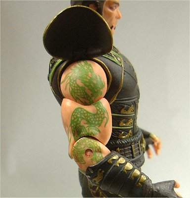 両腕には緑のドラゴンのタトゥーがプリントされている。