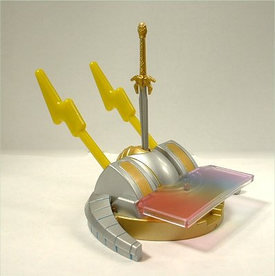 台座に剣を挿し込むと、虹に見立てたカミナリ型のミサイルが発射されるギミックが内蔵されている。