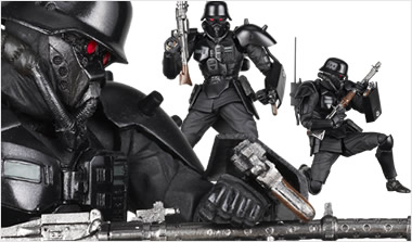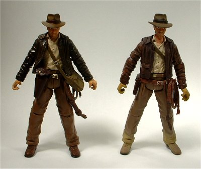 左のシリーズ第一弾のベーシックフィギュアと比べると、デラックス版は同じフルポーザブル素体ながら、乗馬させるために細部に変更が加えられているのがわかる。ベルト廻りではホルスターが小ぶりになり拳銃の収納機能はオミット。サドルバックは邪魔にならないように背後に回されている。